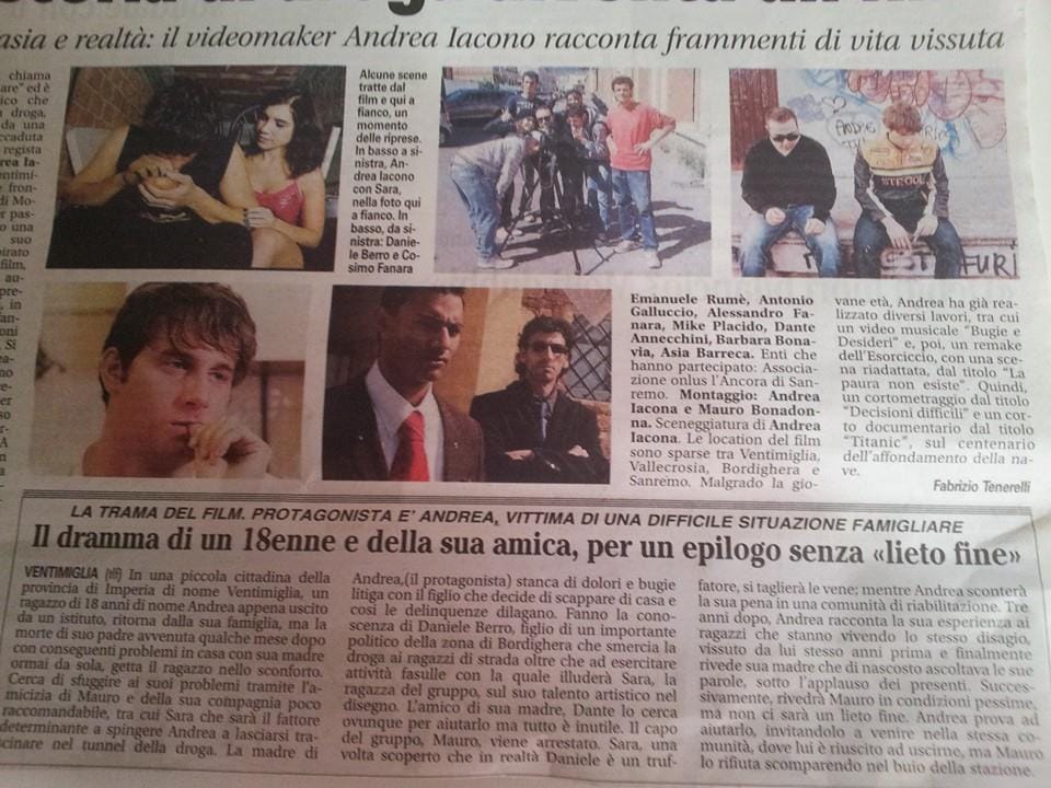 In una piccola cittadina della provincia di Imperia di nome Ventimiglia, un ragazzo di 18 anni di nome Andrea appena uscito da un istituto, ritorna dalla sua famiglia, ma la morte di suo padre avvenuta qualche mese dopo con conseguenti problemi in casa con sua madre ormai da sola, getta il ragazzo nello sconforto. Cerca di sfuggire ai suoi problemi tramite l’amicizia di Mauro e della sua compagnia poco raccomandabile, tra cui Sara che sarà il fattore determinante a spingere Andrea a lasciarsi trascinare nel tunnel della droga. La madre di Andrea, (il protagonista) stanca di dolori e bugie litiga con il figlio che decide di scappare di casa e così le deliquenze dilagano. Fanno la conoscenza di Daniele Berro, figlio di un importante politico della zona di Bordighera che smercia la droga ai ragazzi di strada oltre che ad esercitare attività fasulle. L’amico di sua madre, Dante lo cerca ovunque per aiutarlo ma tutto è inutile. Il capo del gruppo, Mauro, viene arrestato, mentre Andrea sconterà la sua pena in una comunità di riabilitazione. Tre anni dopo, Andrea racconta la sua esperienza a ragazzi che stanno vivendo lo stesso disagio, vissuto da lui stesso anni prima e finalmente rivede sua madre che di nascosto ascoltava le sue parole, sotto l’applauso dei presenti.